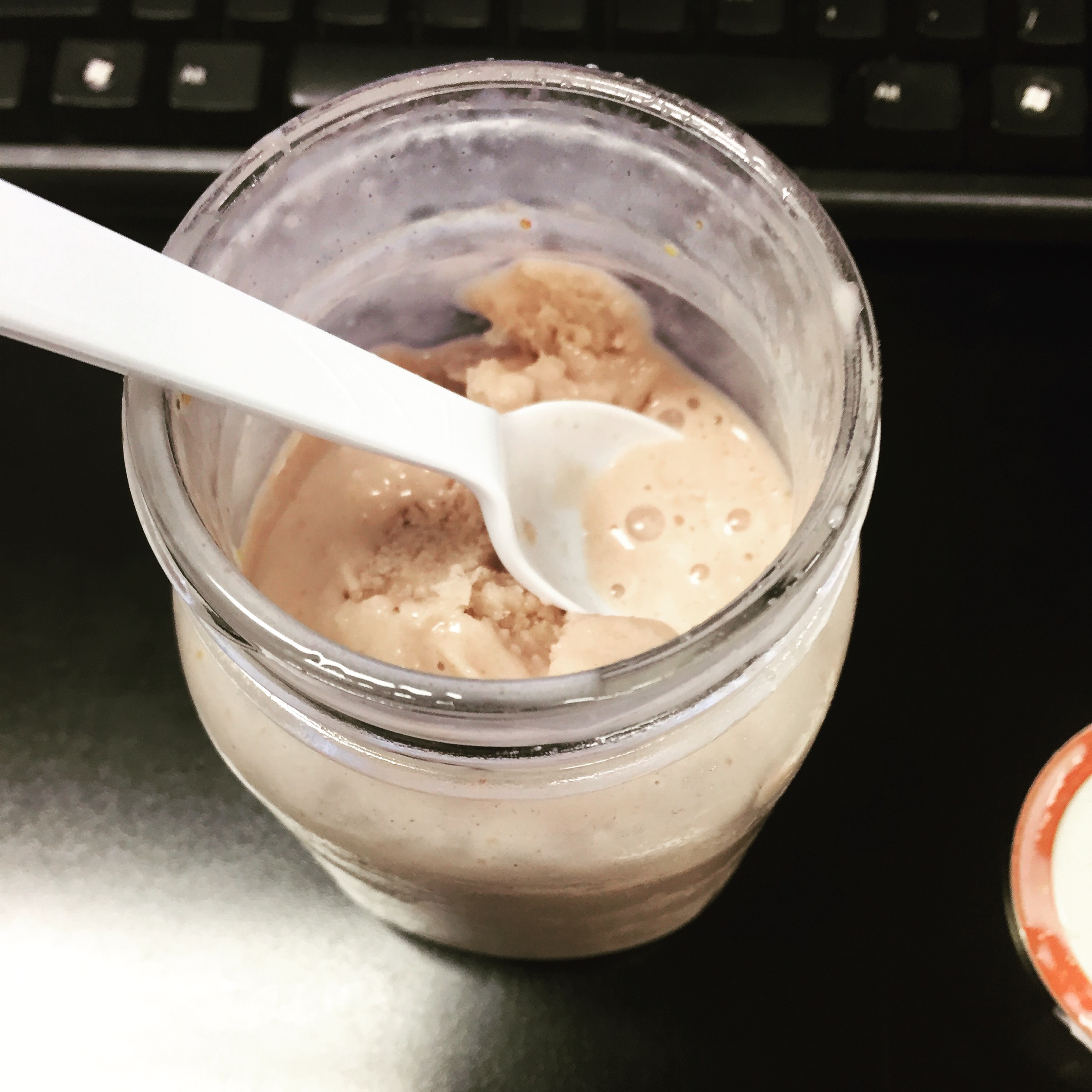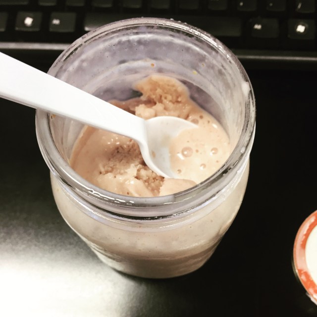 These usually take an hour or so before it’s defrosted. Do not wait too long to eat, because it can become thin very fast, depending on the ingredients used. I usually wait until it’s about half way defrosted and then I shake it up. I either eat it with a spoon or shake it a bit more and use a straw.